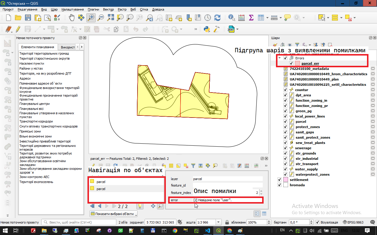 Якщо при перевірці будуть знайдені помилки, на ескізі легко знайти шар, об'єкт, атрибут і що з ним не так.