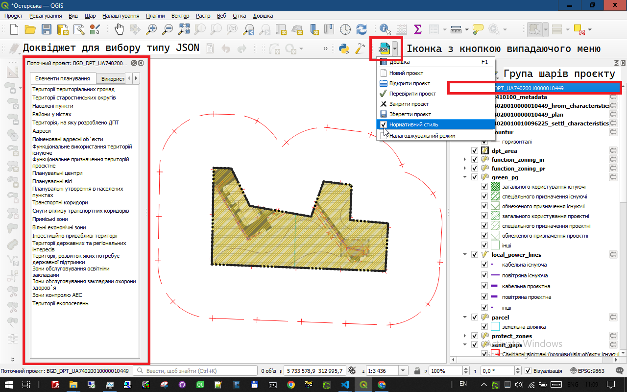На малюнку нижче показано зображення ДПТ, створеного у Digitals, і відкритого, як проєкт json_ua із застосуванням нормативних стилів. Червоними прямкутниками виділено три компоненти інтерфейсу, якими користувач керує роботою json_ua: - Іконка з кнопкою випадаючого меню на панелі QGIS. - Зліва - Доквіджет для вибору типу JSON (шару). - Справа - Група шарів проєкту (частково закрита розкритим меню).